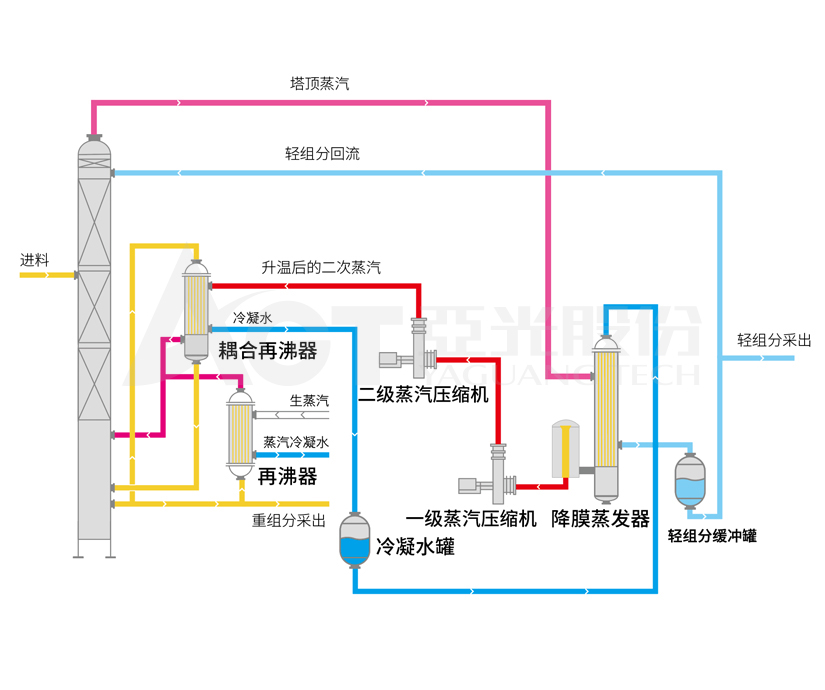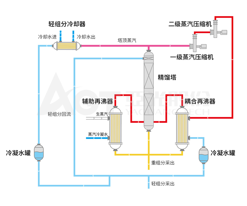 在传统精馏塔系统中引入压缩机,塔顶低温低压的蒸汽经压缩机压缩后变成高温高压气体,然后经过再沸器作为热源给物料加热,通过再沸器被冷凝后的轻组分冷凝液,经过缓冲罐缓冲,再通过回流泵输送,部分采出部分回流。